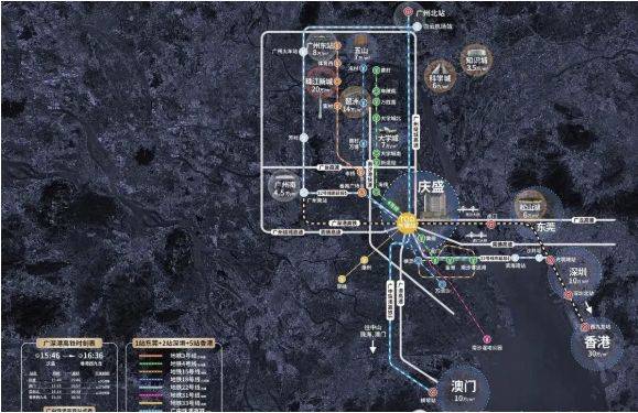 项目交通优势显著。位于庆盛枢纽区块东涌大道,距离东涌地铁站较近,且与庆盛枢纽约 1.2 公里。越秀地产匠心打造的超级连廊,参考纽约高线公园与香港人行天桥的架空设计,不仅遮雨遮阳,保障安全出行,还无缝连接居住地块、产研地块、香港科技大学(广州)、河涌公园、街心公园及东涌地铁站等丰富配套,实现高效便捷的互联互通。通过庆盛站,搭乘广深高铁,9 分钟可到东莞虎门、30 分钟到深圳北、35 分钟到西九龙。此外,双高铁规划,联结广深港高铁与规划中的广中珠澳高铁,可直达深圳北与香港西九龙;四地铁布局,4 号线 号线 号线 号线(规划中)“四线交汇”,未来一站抵达番禺广场,快速通达广州中心区,实现跨城出行的便捷高效,融入大湾区快速发展的交通网络。