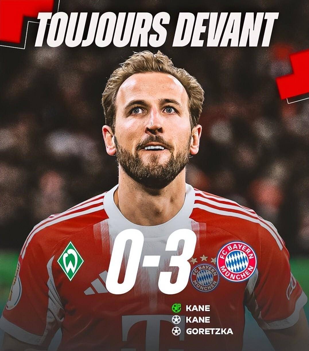 视线转向德国北部,拜仁慕尼黑客场挑战云达不莱梅的比赛则呈现了完全不同的叙事节奏。 比赛第22分钟,拜仁小将伦纳特·卡尔在禁区内被犯规,主裁判在观看VAR回放后判罚点球。 站在点球点前的是哈里·凯恩,这位英格兰队长冷静助跑,稳稳将球罚进,拜仁1-0领先。 这粒进球不仅是凯恩本赛季的第9个点球,更标志着他职业生涯总进球数达到了499个。 然而好戏才刚刚开始,仅仅3分钟后,第25分钟,凯恩在禁区外接到队友传球,稍作调整后起脚远射,皮球击中门柱内侧弹入网窝。 2-0! 凯恩在5分钟内完成梅开二度,而更重要的是,这粒进球让他正式跨过了职业生涯500球的门槛。