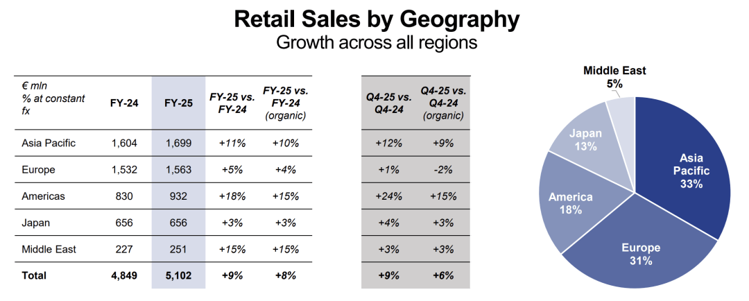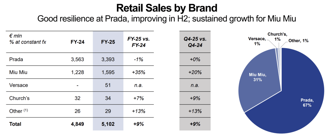 分品牌来看,Prada品牌零售销售额与去年基本持平录得34亿欧元,第四季度录得销售额有所改善;Miu Miu零售销售额增长35%至15.95亿欧元,第四季度增长19.7%;Church’s零售销售额增长7.1%至3368万欧元;Versace范思哲品牌于2025年12月2日并表,零售销售额录得5134万欧元(2025全年品牌净营收6.84亿欧元);其他品牌共录得2932万欧元。Miu Miu继续担任集团增长先锋,但是对比该品牌去年同期93.2%的惊人增幅就逊色不少了。